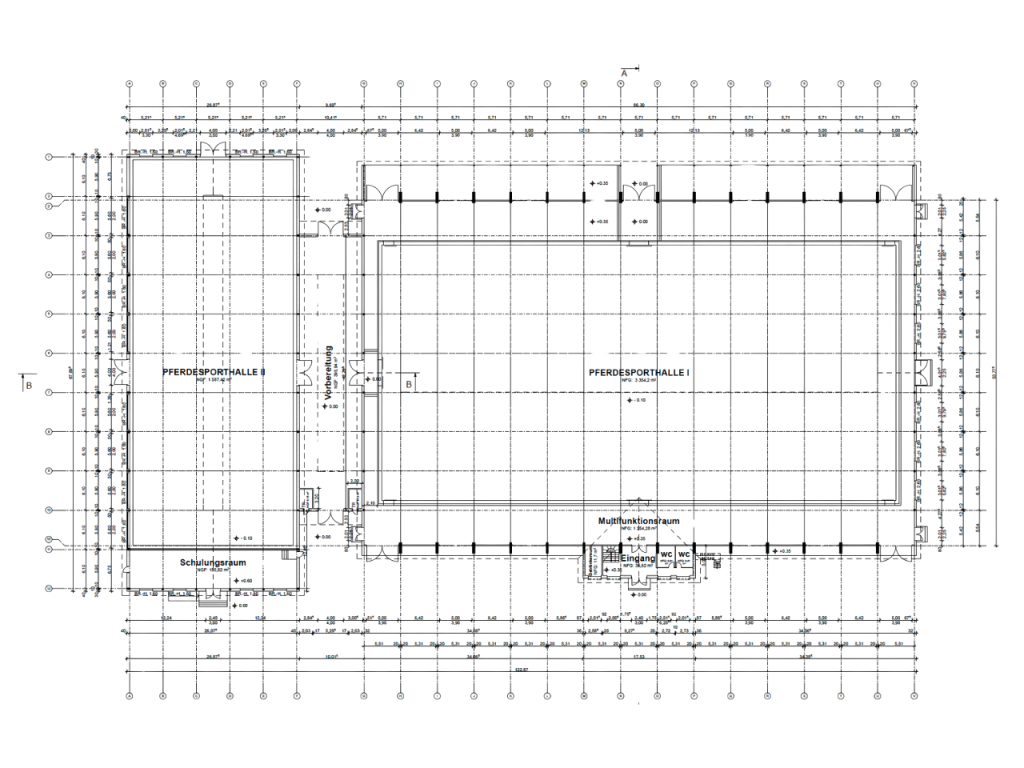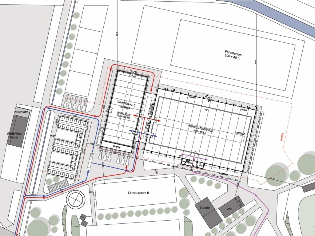 The facility features a main competition indoor arena with a 40 x 80 m footing for large-scale events, as well as a smaller warm-up arena. Both halls are connected via a covered walkway to ensure maximum comfort and usability during the colder months. The building also houses an equestrian retail store and a fully glazed VIP lounge on the upper floor of the main arena, offering catering and an exceptional view of the competitions.